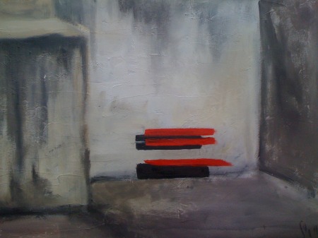 Abstraktion eines Bildes, das ich 1987 in Tempera gefertigt habe. Eine rote Bank irgendwo in Italien, die Luft flimmert vor Hitze und es riecht nach Meer. Acryl auf Leinwand: 50 X 70 cm. verkauft.